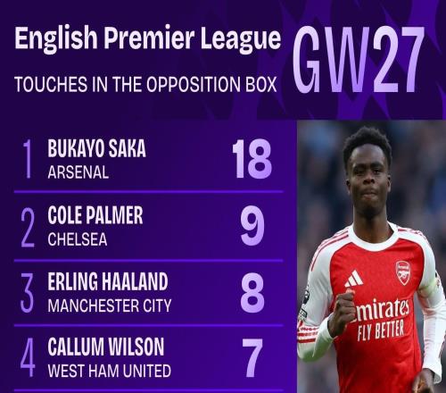 薩卡單場(chǎng)18次在對(duì)方禁區(qū)內(nèi)觸球,比熱刺全隊(duì)加起來(lái)多11次