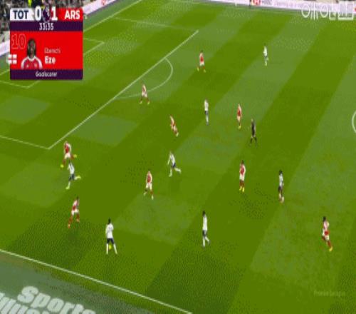 第32分鐘,埃澤凌空抽射破門!阿森納客場(chǎng)1-0領(lǐng)先熱刺!