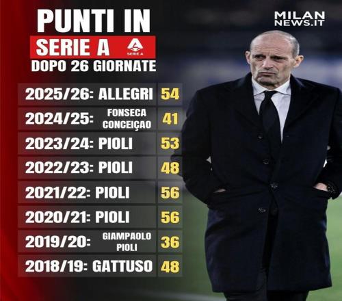 北京時間2月24日,米蘭新聞網統(tǒng)計出了AC米蘭近8個賽季意甲前26輪過后的成績,本賽季阿萊格里率隊拿到54分為近8個賽季的第二高積分。