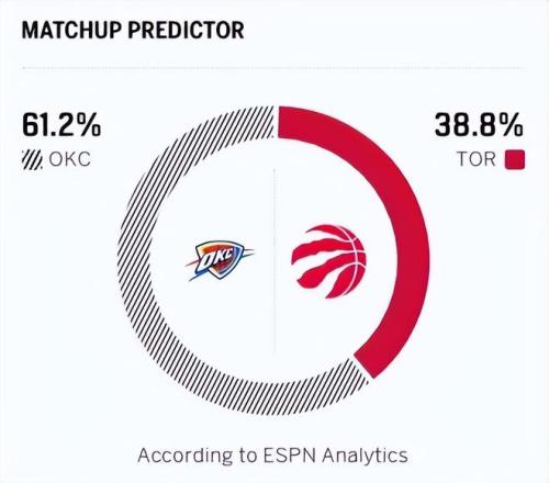 反觀猛龍,近期連續(xù)拿下實(shí)力不強(qiáng)的公牛和雄鹿,拿到2連勝。猛龍此前曾有不錯(cuò)表現(xiàn),近期球員狀態(tài)起伏,但他們的整體實(shí)力不差,面對(duì)弱隊(duì)足以取勝。上場(chǎng)比賽巴恩斯缺陣,英格拉姆得22分,奎克利爆發(fā)砍下32分9助攻,猛龍的主要問題在于外線得分不夠穩(wěn)定。這場(chǎng)比賽雷霆得分前四的球員中有三人傷缺,球隊(duì)實(shí)力受損明顯,猛龍表現(xiàn)也不穩(wěn)定,預(yù)計(jì)兩隊(duì)會(huì)進(jìn)入膠著戰(zhàn),不過,猛龍憑借主場(chǎng)優(yōu)勢(shì),有很大希望取勝。不過,ESPN的數(shù)據(jù)模型倒是看好雷霆,預(yù)測(cè)雷霆的勝率61.2%,猛龍勝率只有38.8%。