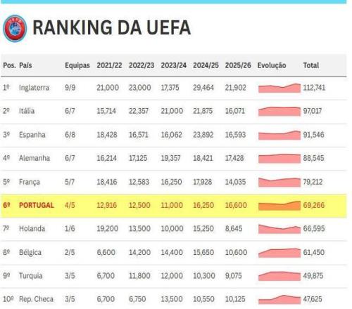 此外,葡萄牙仍有機會在下個賽季獲得三個歐冠正賽名額。然而,這一前景較為悲觀,要獲得歐足聯(lián)分配的額外名額,葡萄牙必須成為2025-26賽季積分排名前兩名的協(xié)會之一。