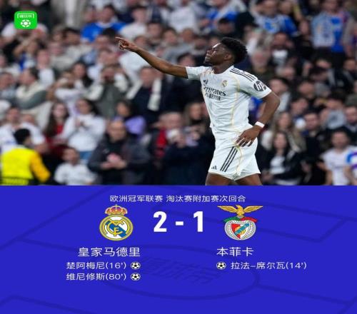 北京時(shí)間2月26日歐洲冠軍聯(lián)賽 淘汰賽附加賽次回合,皇家馬德里對(duì)陣本菲卡。皇家馬德里楚阿梅尼破門(mén),維尼修斯破門(mén)。本菲卡拉法-席爾瓦破門(mén)。最終比分皇馬 2-1 本菲卡。兩回合總比分皇馬3-1本菲卡。