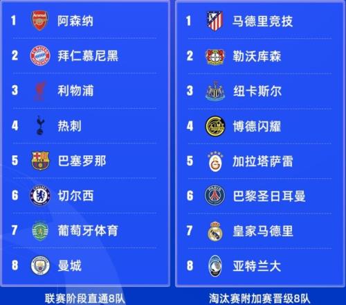 直通8隊(duì)(聯(lián)賽階段前8):阿森納(英超)、拜仁(德甲)、利物浦(英超)、熱刺(英超)、巴薩(西甲)、切爾西(英超)、葡萄牙體育(葡超)、曼城(英超)