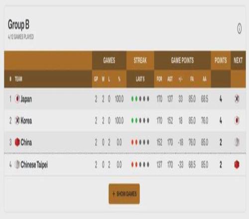 中國男籃與日本隊(duì)、韓國隊(duì)、中國臺(tái)北隊(duì)同處B組。截至本場賽前,中國男籃排名小組第三。