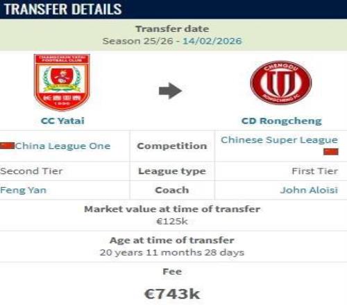 德轉(zhuǎn)顯示,賀一然加盟成都蓉城的轉(zhuǎn)會費為74.3萬歐元,約600萬人民幣,現(xiàn)在他的身價為12.5萬歐元。
