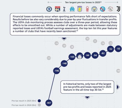 歐足聯(lián)統(tǒng)計2025年歐洲稅前虧損最高的10家俱樂部: