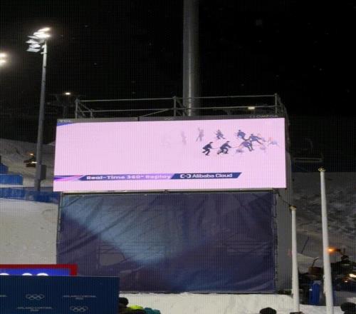 在米蘭-科爾蒂納冬奧會四大賽區(qū)之一的利維尼奧賽區(qū),當(dāng)每一場比賽開始前,觀眾的目光往往會被場地中央那塊巨大的屏幕所吸引。