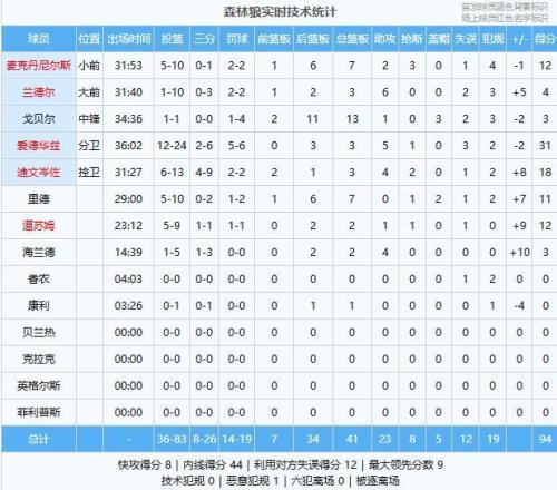 森林狼:愛德華茲31分3板5助、迪文岑佐18分3板4助2斷、麥克丹尼爾斯12分7板2助3斷、道蘇姆12分2板1助、里德11分7板2帽、蘭德爾4分3板6助、戈貝爾3分13板1助3帽
