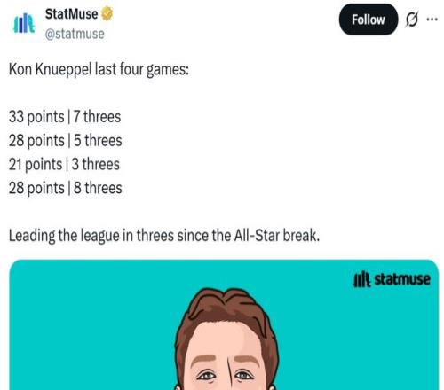 更讓人眼前一亮的是,克努佩爾幾乎沒有遭遇新秀墻,反而開季至今狀態(tài)一路呈現(xiàn)出上揚(yáng)勢頭,全明星后的5場比賽克努佩爾合計命中多達(dá)26記三分高居同期聯(lián)盟第一。