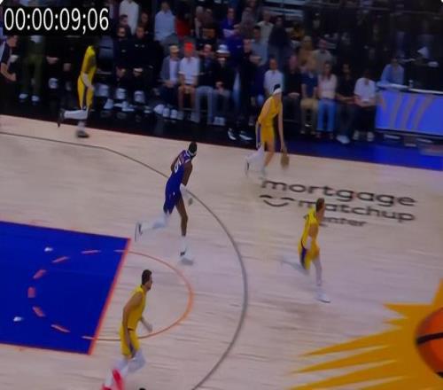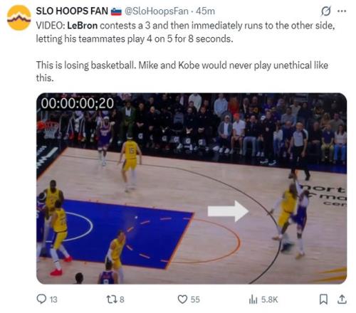 斯洛文尼亞的湖人球迷曬出了上半場詹姆斯的防守一幕,在詹姆斯防下杰倫-格林的三分出手后他就直接下快攻了,結(jié)果這個籃板被太陽拿到,詹姆斯并沒有回防。
