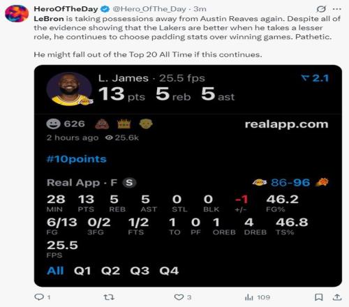 詹黑媒體HOTD:詹姆斯又一次讓里夫斯失去投籃機(jī)會,盡管種種跡象表明勒布朗減少出手是對湖人最好的,但他卻為了數(shù)據(jù)瘋狂出手,他是為了數(shù)據(jù)而非勝利太可悲了,如果他這樣打下去,他未來將掉出歷史前20之內(nèi)。